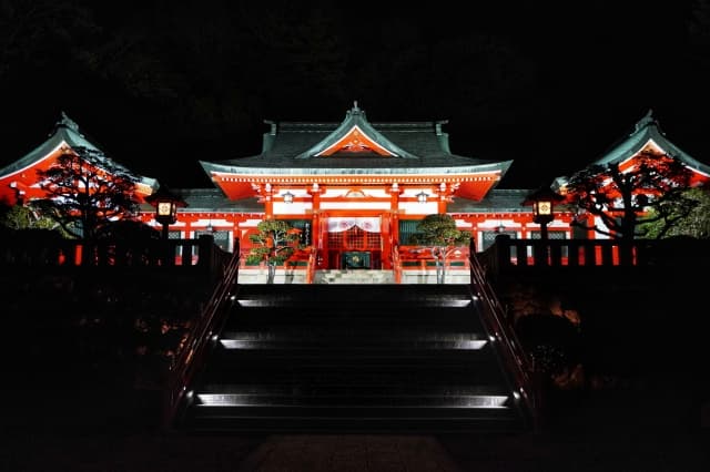 鮮やかな朱色の社殿は緑豊かな木々に映えて、見る者に強い印象を与えます。