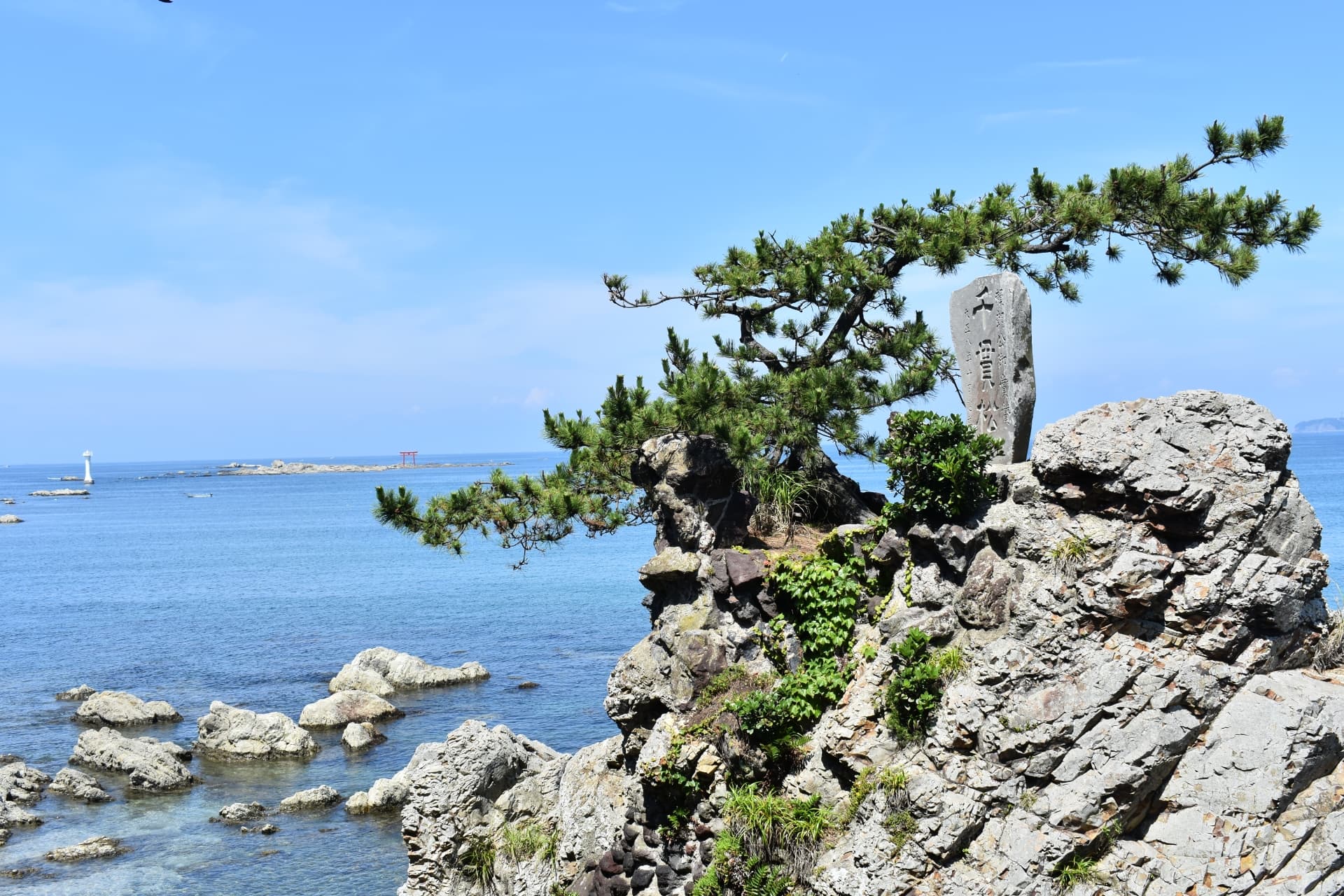海沿いの岩の上に立つ、風格ある松。昔、神社に立ち寄った武将たちがその美しい松の枝ぶりを称え、「千貫松」と名付けた――という言い伝えがあります。