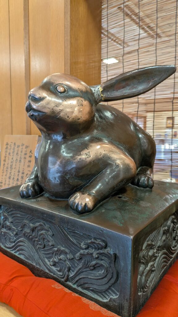 神社内の「 なでうさぎ 」は、縁起物として親しまれています。卯(う)の年・月・日に祭が行われることから、「卯」が「うさぎ」と結びつき、この像を撫でて願い事をする習わしが続いているんです。